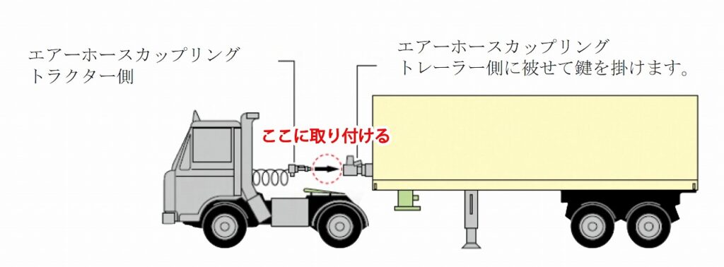 トレーラー側の “赤ライン(エマージェンシーライン)”の接続カップリングに装着します。